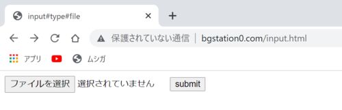 inputタグのtype属性に"file"を指定すると、ファイルを選択できる。<input> - フォーム部品:入力欄 - とほほのWWW入門input.htmlで、このように"type=file"と"type=submit"を組み合わせると、ファイルをアップロードできるらしい。 「ファイルを選択」を押すと「フ…